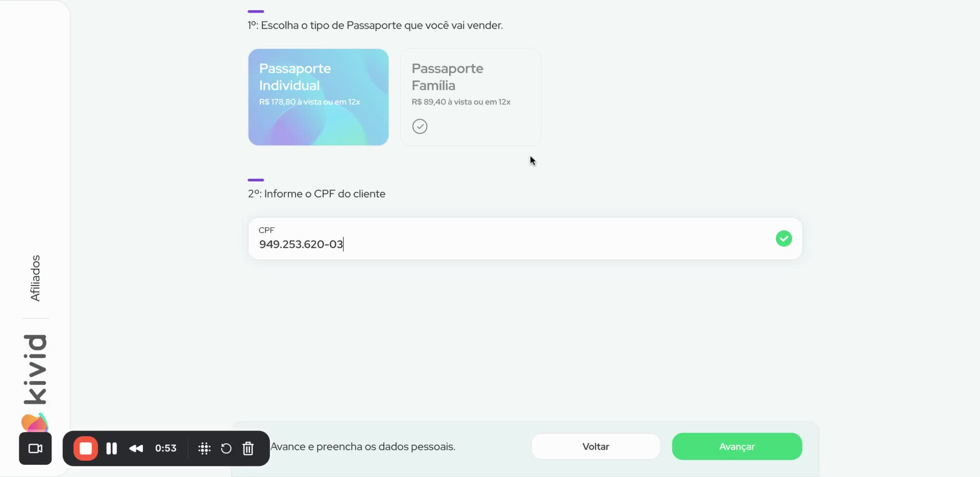 Além da venda pelo link, também é possível vender um Passaporte Individual diretamente dentro da plataforma de vendas do afiliado. Nesse caso, é o próprio afiliado quem preenche os dados do cliente durante o processo de compra.
